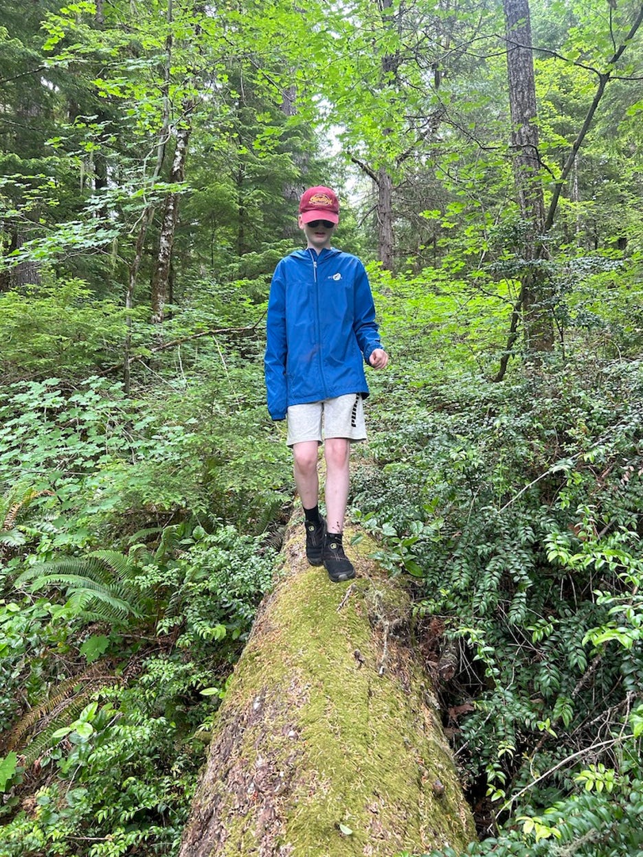 The mist is a gently breathing thing. It softens. It also obscures. Sometimes these amount to the same thing. In the fog beyond the meadow a narrow trail opens to the spring. The boys and I walked there yesterday. Edmund is nervous about leading because his eyesight is diminished by albinism. My goal is to bring him often enough that he can memorize the route. Even for normal eyes the trail vanishes into dense salmonberry foliage at the edge of the old forest. Beyond this point it becomes a phantom, grown over by plant beings who dwell in the subdued light of the understory: dwarf Oregon grape, salal, and small hemlocks. We always stop for the log walk. Edmund balances along the uprooted corpse of a large Douglas-fir, teetering along it to a point beneath the vine maples where the trunk becomes too narrow to follow further.