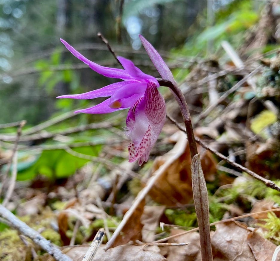 Beyond the downed log a steep bank rises on the right to a mossy hollow above the path. By mid-May, the time for Lady Slippers, the vernacular name for Calypso Orchid that I grew up with, is ending. Their thumb-size blossoms of bulbous pink and lavender were Mom’s favorite wildflower. Decades ago Mom chose this small depression shaded by big trees and fringed with decaying logs to transplant some bulbs. Mom was a rescuer. Cats, dogs, Guinea fowl, a gaggle of prepubescent Bantum roosters, and a mistreated goat from next door had been some of the beneficiaries of her mercy, and the orchids had likely been saved from certain death somewhere on a planned clearcut. She checked on them faithfully every spring for as long as she was able to make this walk. I can’t remember how many she placed there originally, but this spring they have been reduced to one. Today the single blossom has faded toward late spring, transformed from vibrant flamingo to pale pink.